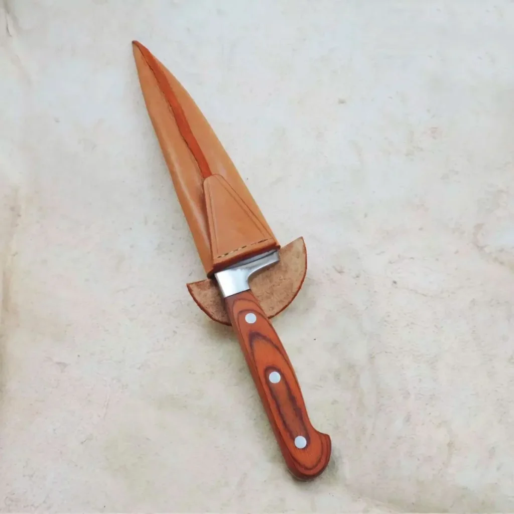 Cuchillo de asador, cabo de madera, vaina de suela artesanal