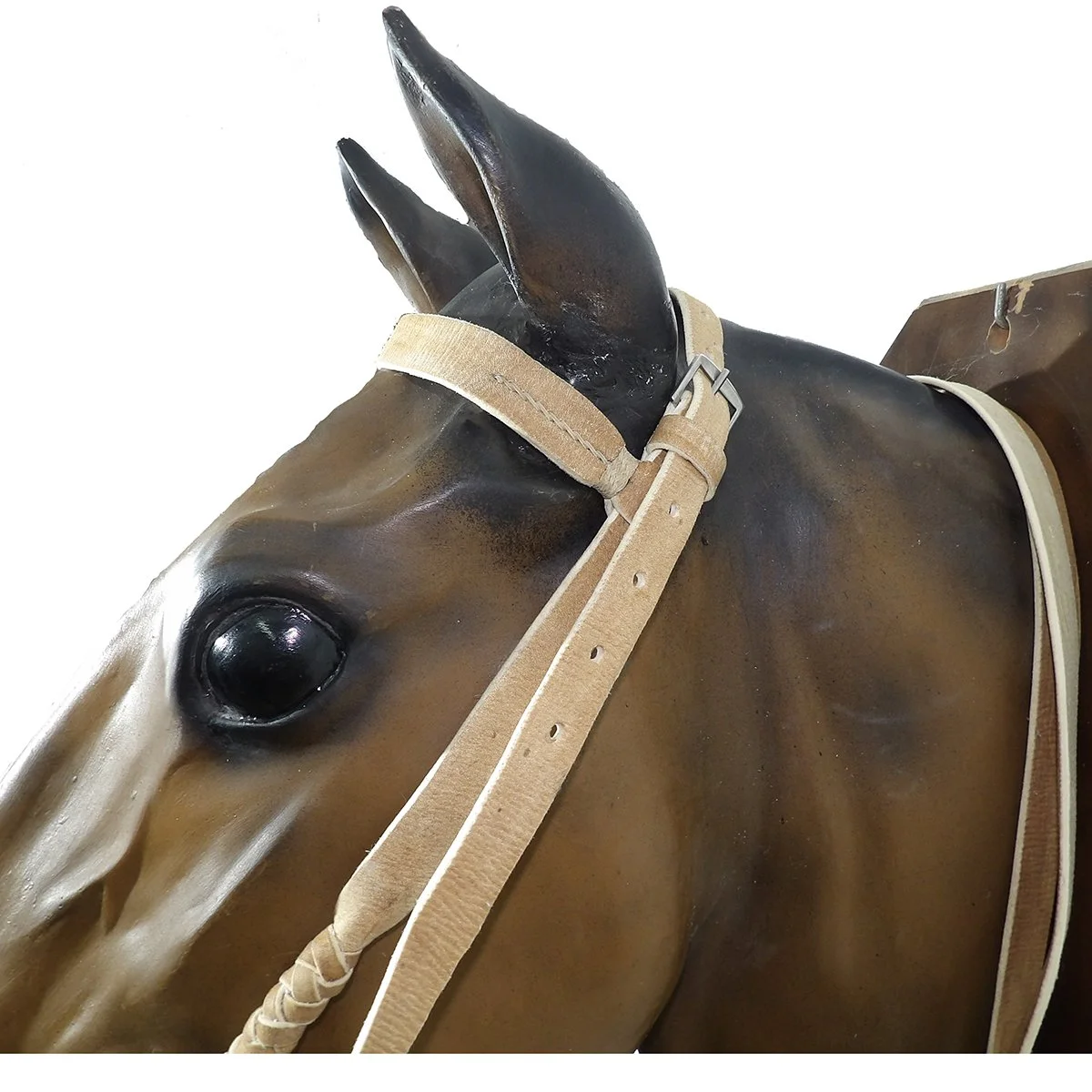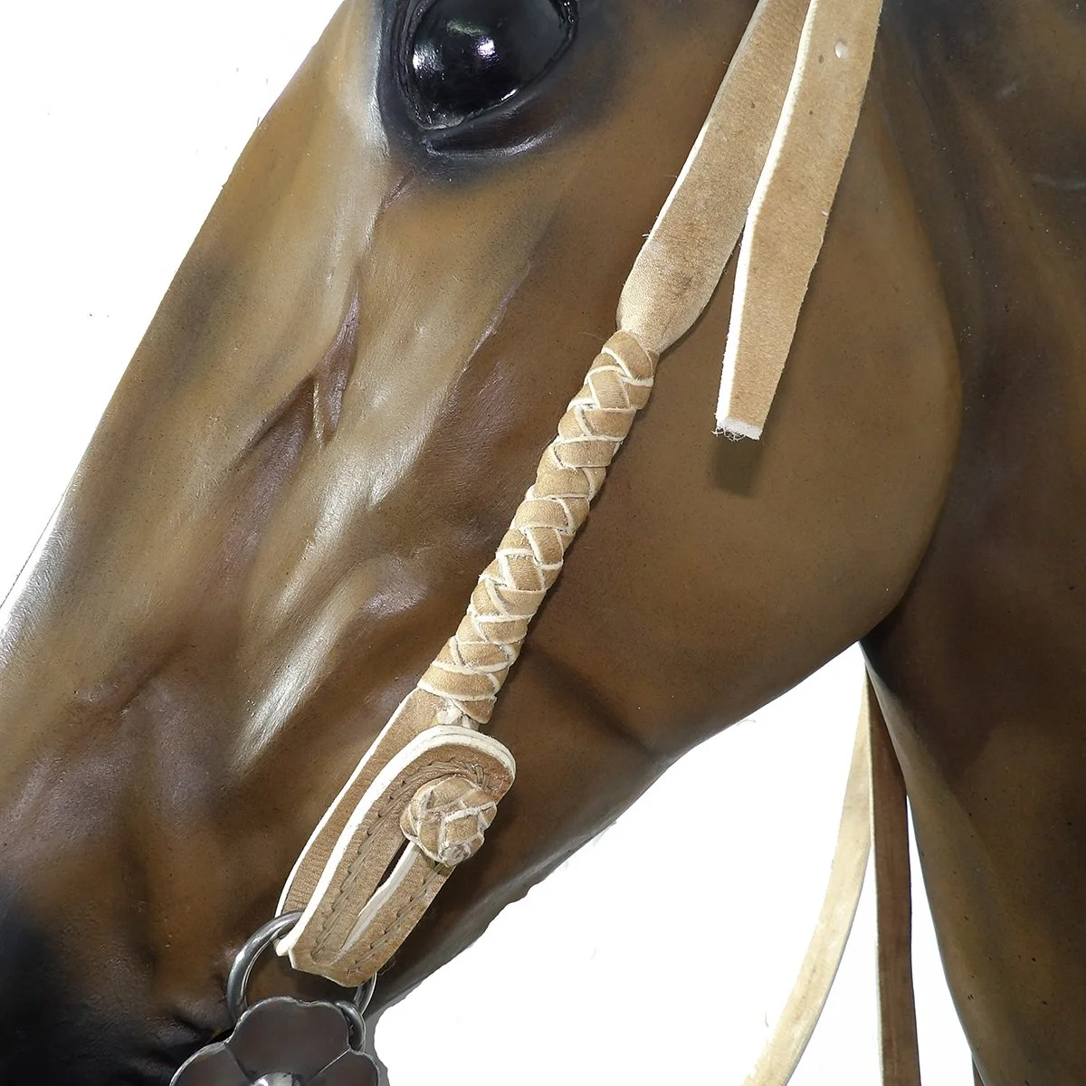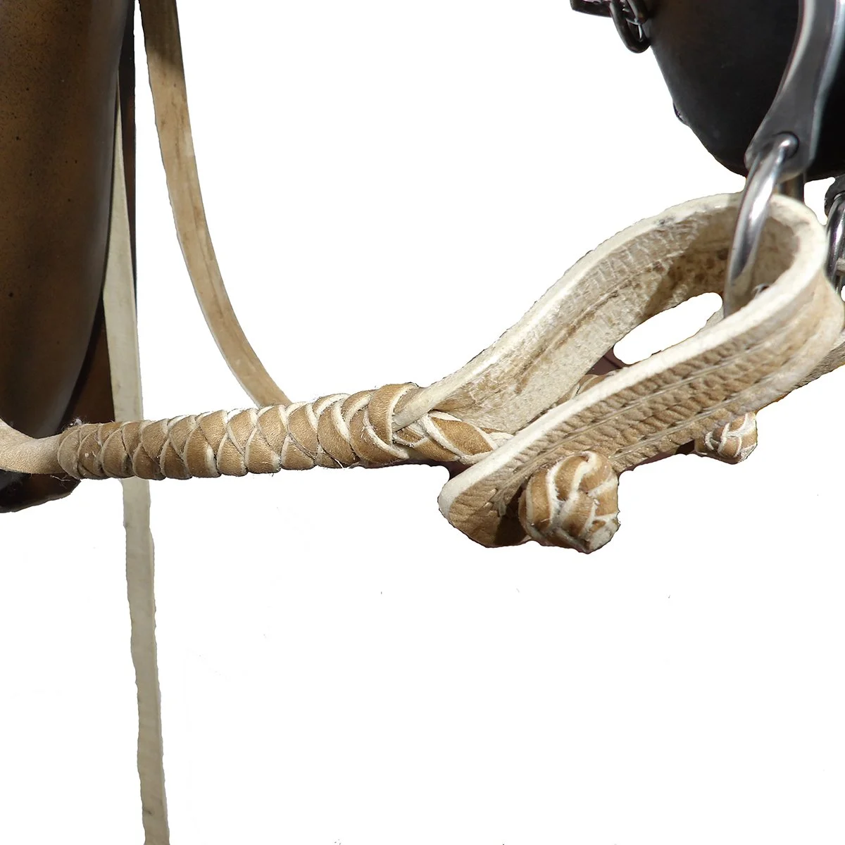 Cabezada y riendas de cuero crudo con macho trenzado y hebilla de acero inoxidable.