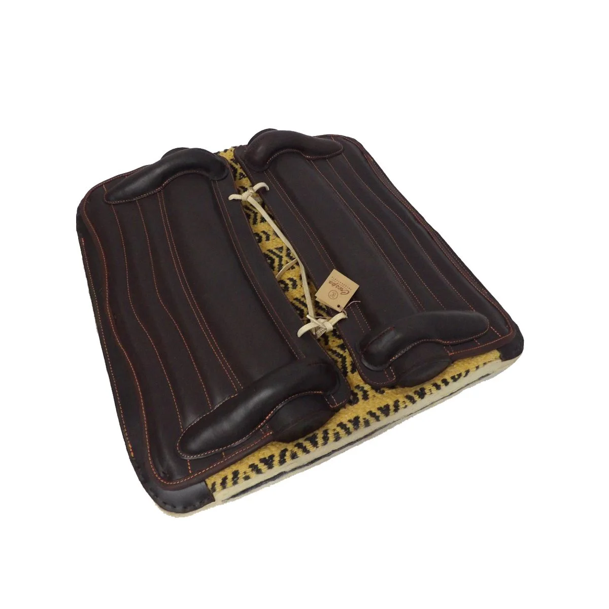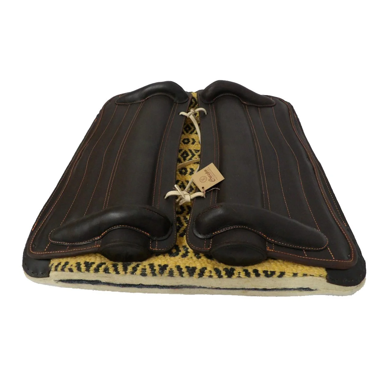 Bastos de vaqueta de color marrón confeccionado con cueros de primera calidad, la falda del basto están bastoneadas y rellenas con algodón totalmente ribeteado, además tiene mandil de lana blanco de buen espesor, en ambos extremos posee un refuerzo de mandil de lana blanco y rojo para elevarlo en sus extremos y poder lograr que se adapte de la mejor manera al lomo del caballo.Un artículo súper recomendable.